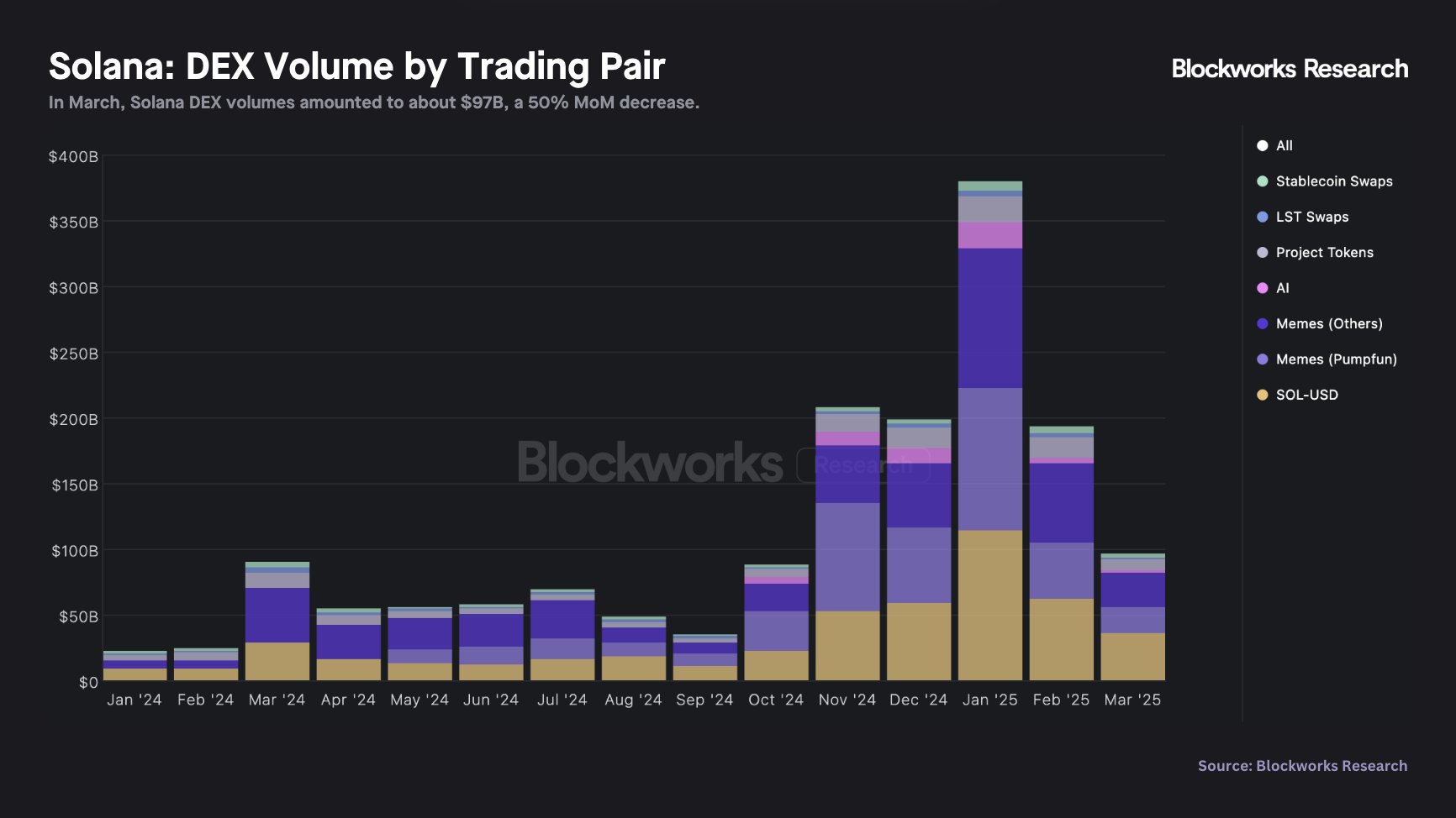 Dữ liệu on-chain Solana trong tháng 3/2025 do Blockworks Research cung cấp - khiến nhiều người dùng e ngại: REV lao dốc 64%, DEX mất một nửa volume, memecoin thì hạ nhiệt.