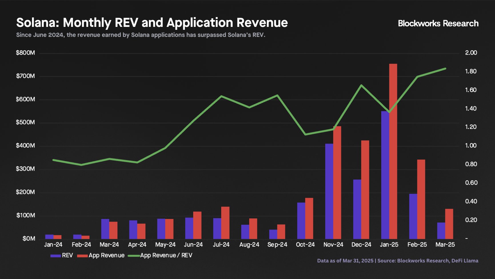Dù tổng REV sụt giảm, Solana vẫn chiếm tới 34% thị phần toàn cầu, bỏ xa Ethereum chỉ với 18%. Người dùng vẫn chọn Solana là nơi "xuống tiền". Và còn ấn tượng hơn: Mỗi 1 USD giao dịch REV tạo ra tới 1,84 USD doanh thu ứng dụng - hiệu suất cao nhất từ trước tới nay. Điều này đồng nghĩa, ít giao dịch hơn, nhưng giá trị mỗi giap dịch ngày một lớn hơn.