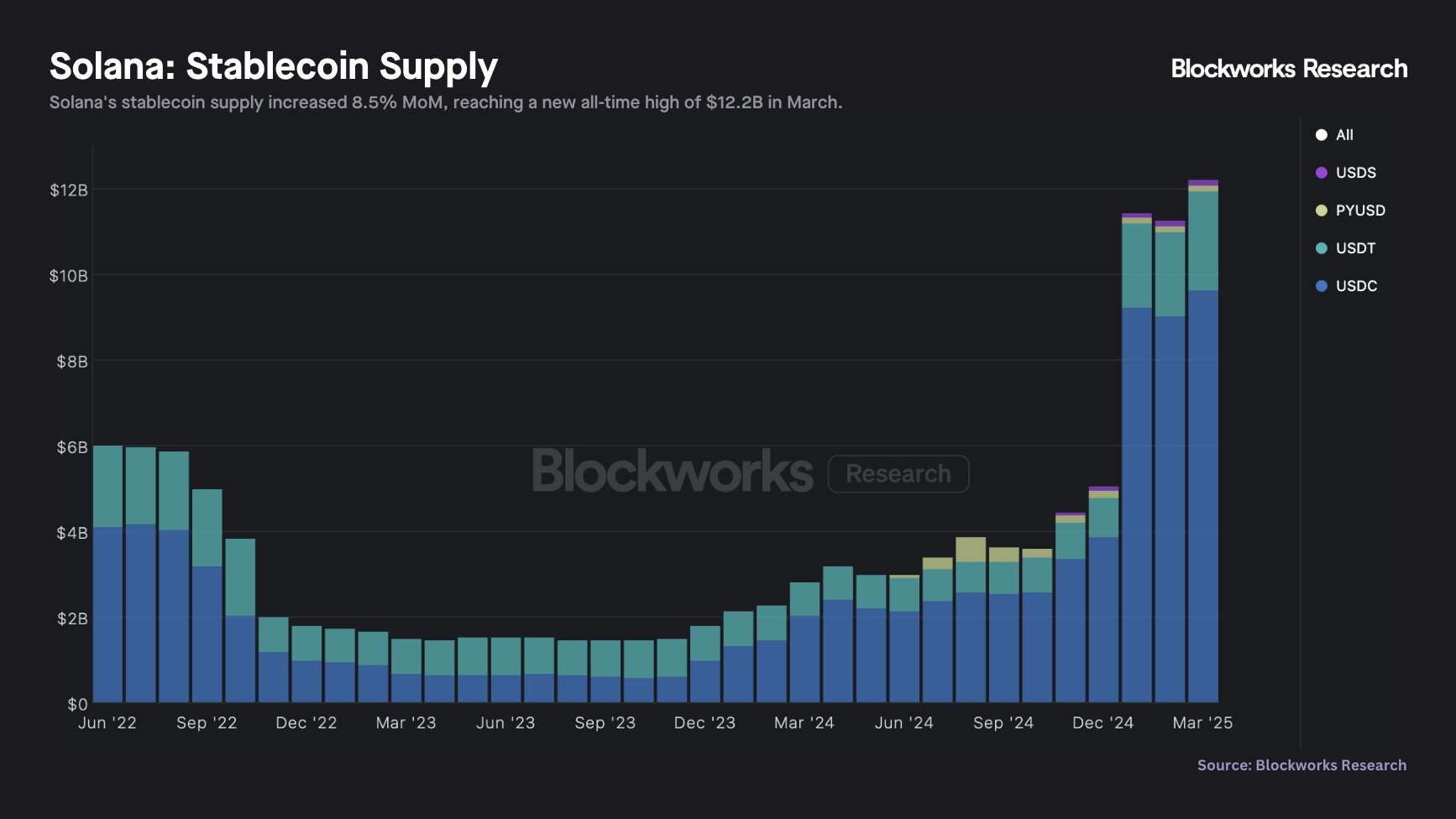 Nguồn cung stablecoin trên Solana: Vượt mốc lịch sử 12,2 tỷ USD vào tháng 3/2025 (Nguồn: Blockworks Research)