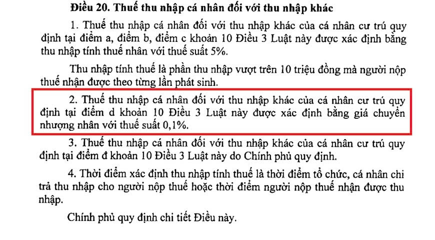 Thuế thu nhập cá nhân đối với loại tài sản số sẽ được tính theo giá trị chuyển nhượng trong từng lần giao dịch, với thuế suất 0,1% - trích Dự thảo Luật Thuế thu nhập cá nhân (thay thế)