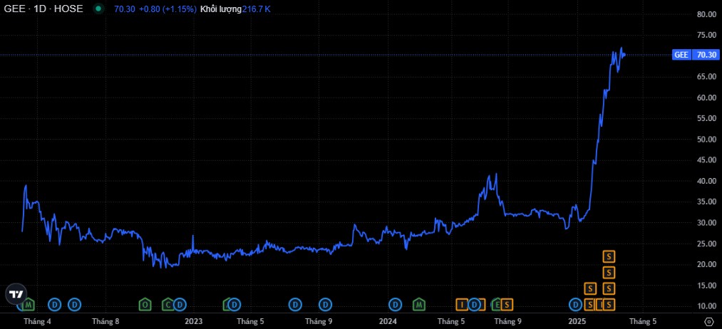 Chào sàn HOSE từ giữa tháng 8/2024 với giá tham chiếu trong phiên giao dịch đầu tiên là 37.150 đồng/cp, đến nay, thị giá của GEE đã tăng gần gấp đôi lên 70.000 đồng/cp. Giá trị vốn hóa thị trường tương ứng đạt 21.400 tỷ đồng.