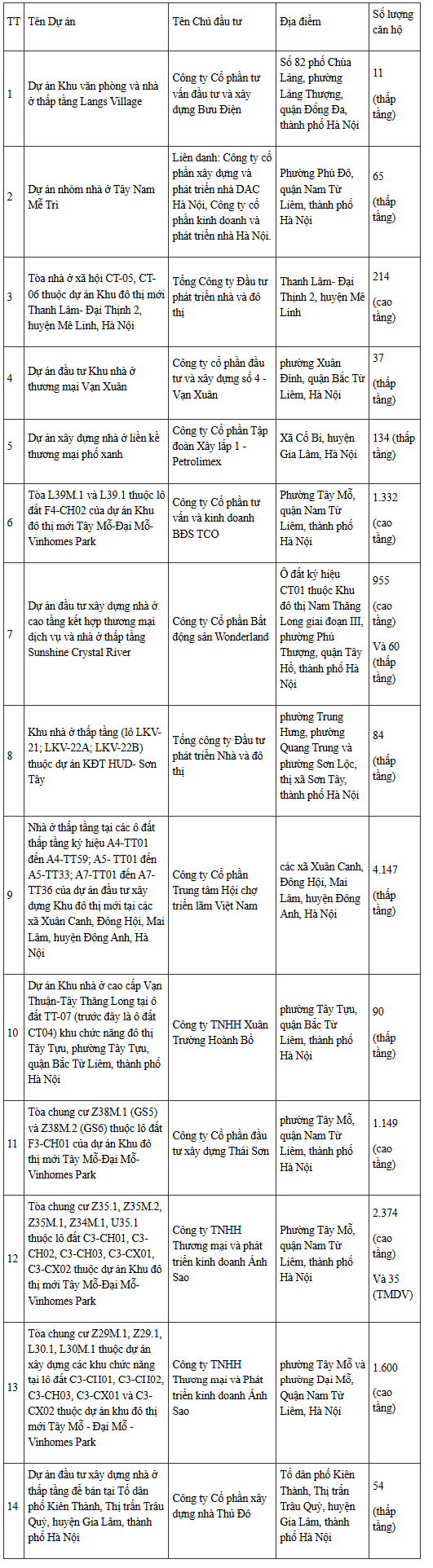 Cụ thể, dự án có số căn được phép đưa vào kinh doanh nhiều nhất là nhà ở thấp tầng tại các ô đất thấp tầng ký hiệu A4-TT01 đến A4-TT59, A5- TT01 đến A5-TT33, A7-TT01 đến A7-TT36 của dự án Vinhomes Cổ Loa (tên thương mại: Vinhomes Global Gate), tọa lạc tại các xã Xuân Canh, Đông Hội, Mai Lâm, huyện Đông Anh (Vinhomes Cổ Loa) do CTCP Trung tâm Hội chợ Triển lãm Việt Nam làm chủ đầu tư với 4.147 căn thấp tầng.