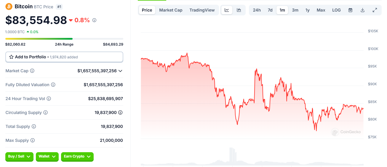Thực tế, giá Bitcoin đã dao động đáng kể trong 30 ngày qua, từ mức cao nhất 98.000 USD xuống mức thấp nhất 76.000 USD, trước khi ổn định quanh 83.000 USD, tương ứng mức giảm 15% kể từ ngày 16/2, theo dữ liệu từ CoinGecko.