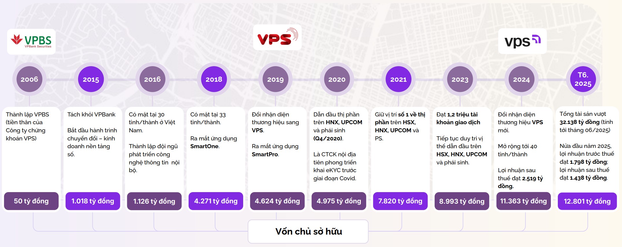Khởi nguồn từ năm 2006 với tên gọi VPBS – công ty chứng khoán thuộc VPBank, VPS có vốn điều lệ ban đầu chỉ 50 tỷ đồng. Hậu VPBank thoái vốn năm 2015, VPS bắt đầu hành trình chuyển đổi, tập trung phát triển theo mô hình nền tảng số và triết lý lấy khách hàng làm trọng tâm chiến lược.