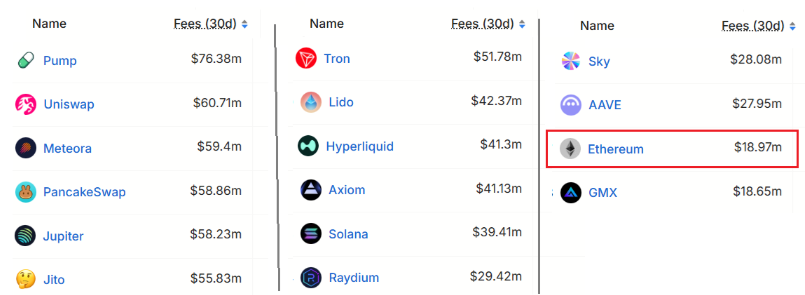 Dù Ethereum vẫn dẫn đầu về tổng giá trị bị khóa (TVL) với 53,7 tỷ USD, nhưng điều đó không giúp ích nhiều cho holder ETH, khi phí mạng chỉ đạt 19 triệu USD trong 30 ngày qua, theo DefiLlama. Trong khi đó, Tron thu được 51,8 triệu USD, còn Solana là 39,4 triệu USD cùng kỳ.