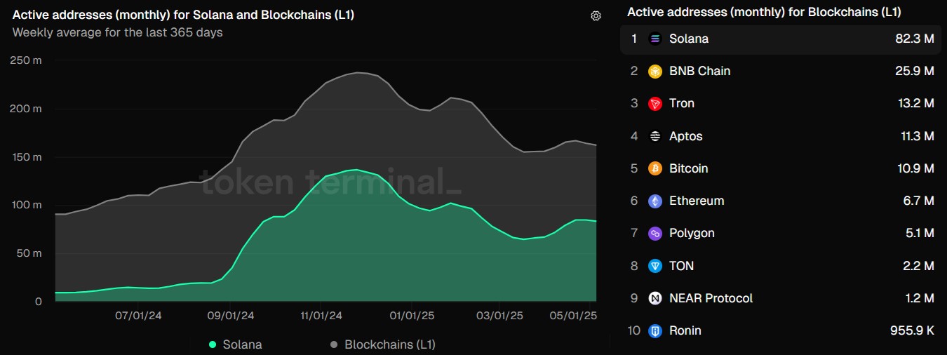 Số ví hoạt động hàng tháng trên các mạng lưới: Solana vượt trội hơn so với các đối thủ (Nguồn: Token Terminal)