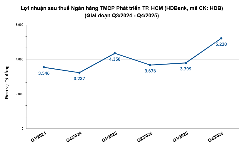 Kết quả, lợi nhuận trước thuế của HDBank trong quý 4/2025 đạt 6.519 tỷ đồng, tăng gần 60% so với cùng kỳ năm trước. Lãi sau thuế đạt 5.220 tỷ đồng, tăng trưởng 61,2%.