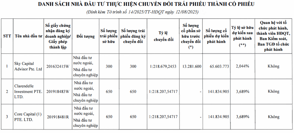 Bên cạnh đó, HDBank dự kiến phát hành tối đa 349,2 triệu cổ phiếu để chuyển đổi 160 triệu USD trái phiếu do 3 nhà đầu tư nước ngoài nắm giữ, bao gồm: Sky Capital Advisor Pte. Ltd, Clarendelle Investment PTE. Ltd và Core Capital PTE. Ltd. Giá chuyển đổi là 10.600 đồng/cp.