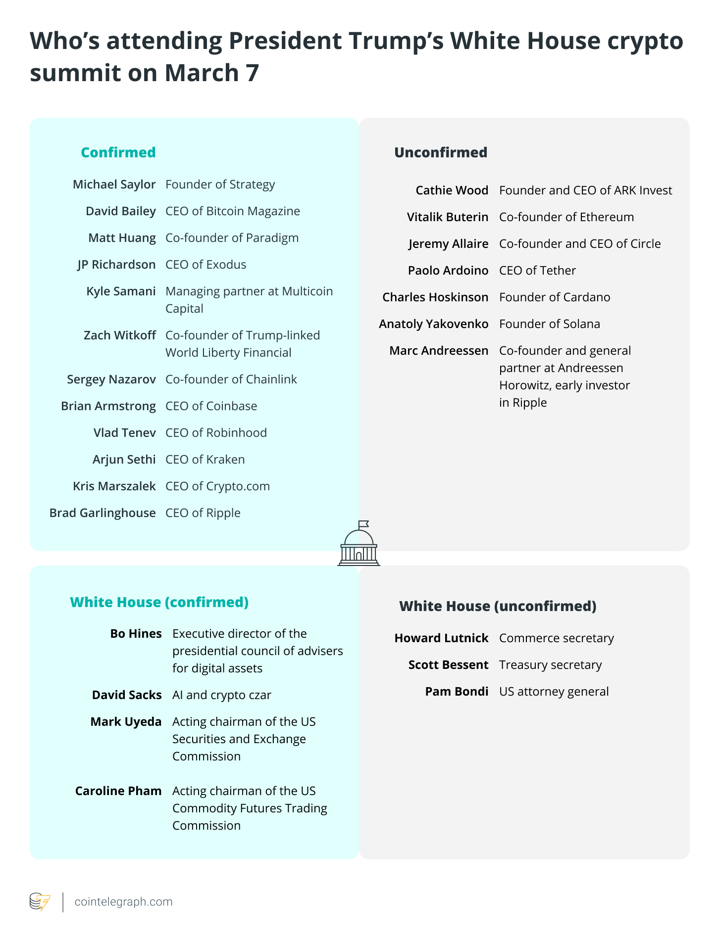 Những nhân vật sẽ tham gia Hội nghị thượng đỉnh Crypto tại Nhà Trắng (Nguồn: Cointelegraph)