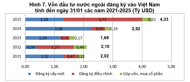 Tính đến ngày 31/01/2025, tổng vốn đăng ký cấp mới, vốn đăng ký điều chỉnh và giá trị góp vốn, mua cổ phần của nhà đầu tư nước ngoài đạt 4,33 tỷ USD, tăng 48,6% so với cùng kỳ năm trước.