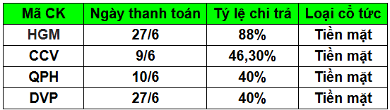 Không chỉ HGM và CCV, trong tuần tới còn có hai doanh nghiệp khác sẽ chốt quyền nhận cổ tức bằng tiền mặt với tỷ lệ 40%.