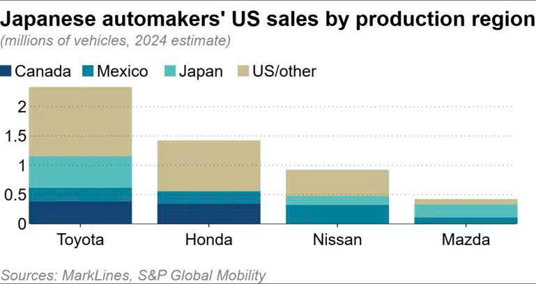 Thị phần xe Nhật tại Mỹ phân theo nơi sản xuất (ước tính năm 2024, đơn vị: triệu xe) (Nguồn: Nikkei Asia)