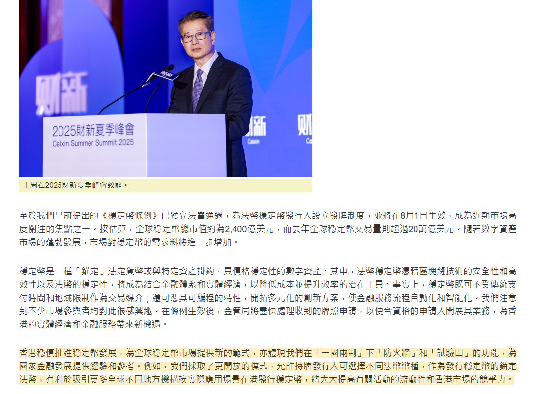 Theo đó, dự luật về stablecoin hiện đã được Hội đồng Lập pháp Hong Kong thông qua, có hiệu lực vào ngày 1/8, trở thành một trong những tâm điểm được thị trường đặc biệt quan tâm gần đây.