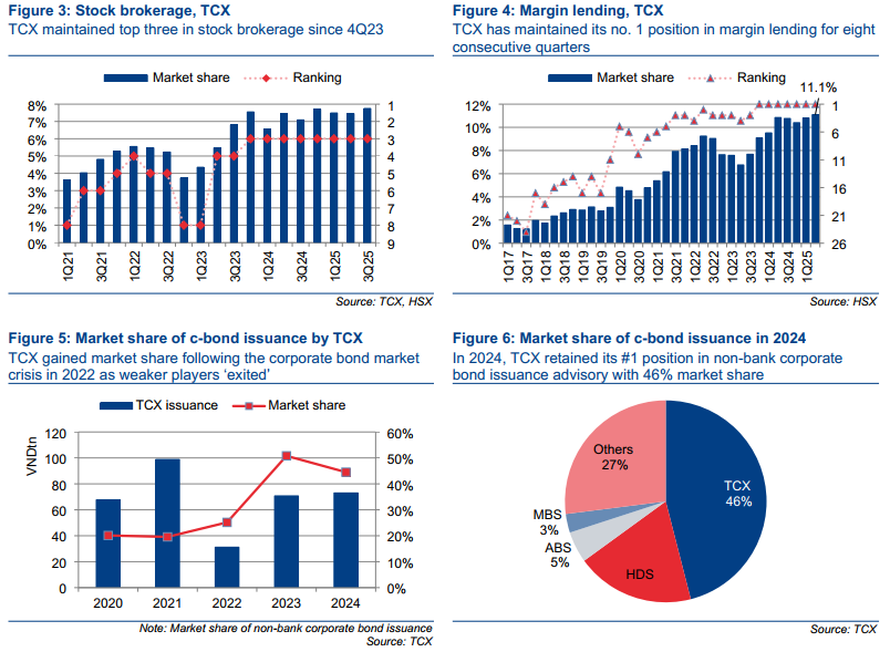 Cụ thể, trong 9 tháng đầu năm 2025, TCX chiếm 46% thị phần tư vấn phát hành trái phiếu doanh nghiệp phi ngân hàng, nắm khoảng 11% thị phần cho vay margin và đạt 7,75% thị phần môi giới cổ phiếu trên HOSE trong quý 3 – thuộc nhóm ba công ty đứng đầu.
