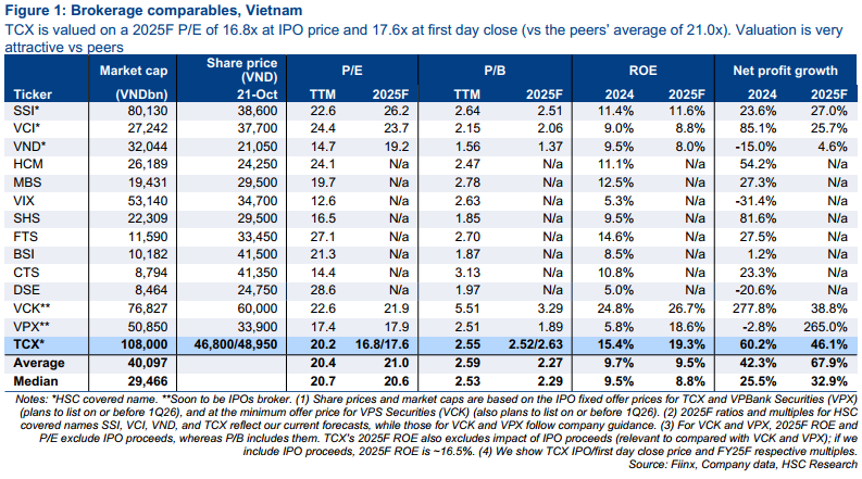 Theo HSC, cổ phiếu TCX đang giao dịch ở mức định giá khá hấp dẫn. Tại giá sau phiên chào sàn, P/E dự phóng năm 2025 là khoảng 17,6 lần, thấp hơn 16% so với trung bình ngành.