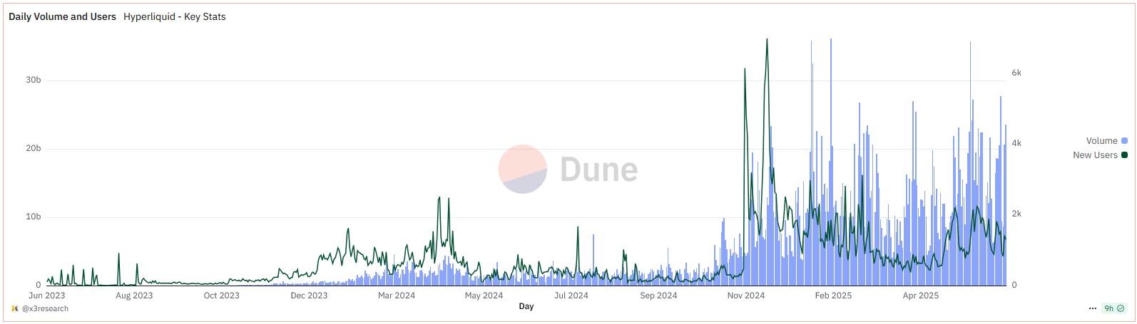 Khối lượng giao dịch và lượng user hàng ngày của Hyperliquid (Nguồn: Dune)