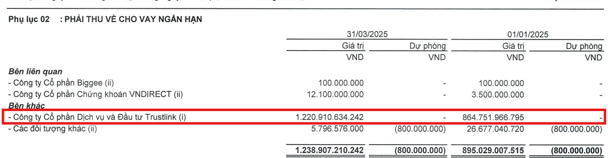 Theo báo cáo tài chính hợp nhất quý 1/2025, IPA VẪN ghi nhận khoản phải thu về cho vay ngắn hạn Trustlink trị giá gần 1.221 tỷ đồng, tăng 365 tỷ đồng so với đầu năm. Đây là khoản vay có thời hạn không quá 12 tháng, lãi suất từ 3,5%/năm đến 9,8%/năm.