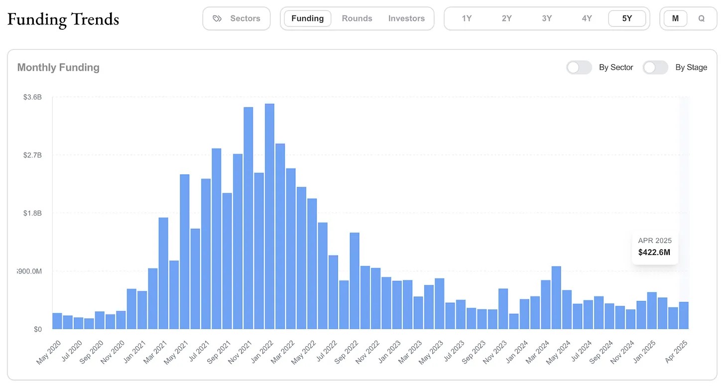 Thị trường đầu tư mạo hiểm vào crypto cũng đang "co lại" rõ rệt. Từ 2022 đến 2024, tổng vốn đầu tư toàn cầu vào crypto giảm hơn 60%, theo Decentralised.co. Tại châu Á, ABCDE Capital - một quỹ đầu tư tại Singapore - gần đây cũng tuyên bố ngừng rót vốn vào các dự án mới và tạm dừng việc gọi vốn. Đây là những dấu hiệu cho thấy xu hướng thị trường đang thay đổi rõ rệt.