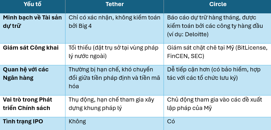 So sánh vị thế pháp lý giữa Tether và Circle (Nguồn: DFF tổng hợp)