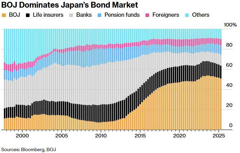 Trong thời gian dài, BOJ là người mua áp đảo trên thị trường trái phiếu chính phủ Nhật Bản. Kể từ thập niên 1990, Nhật Bản rơi vào vòng xoáy giảm phát kéo dài, thường được gọi là “những thập kỷ mất mát".