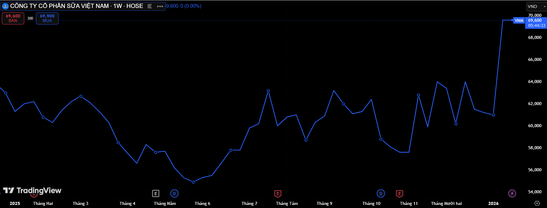 Diễn biến giá cổ phiếu VNM trên thị trường (Nguồn: Tradingview)