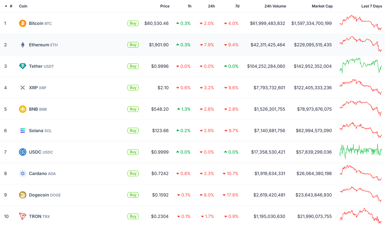 Thị trường crypto, vốn nhạy cảm với tâm lý rủi ro, chịu ảnh hưởng nặng nề dưới bối cảnh vĩ mô trên. Theo dữ liệu từ CoinGecko, Bitcoin (BTC) đã tụt xuống mốc 80.530 USD trong 24 giờ qua, bất chấp thông tin từ sắc lệnh xây kho dự trữ Bitcoin của Tổng thống Trump.
