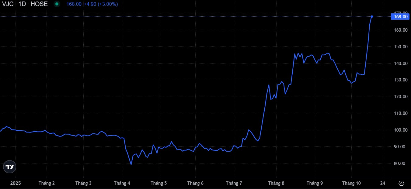 Chốt phiên giao dịch ngày 15/10, cổ phiếu VJC tăng kịch biên độ gần 7% lên 163.100 đồng/cp. Đây cũng là phiên tăng trần thứ 3 liên tiếp, đưa thị giá VJC lên mức cao nhất trong vòng 7,5 năm (từ tháng 4/2018).