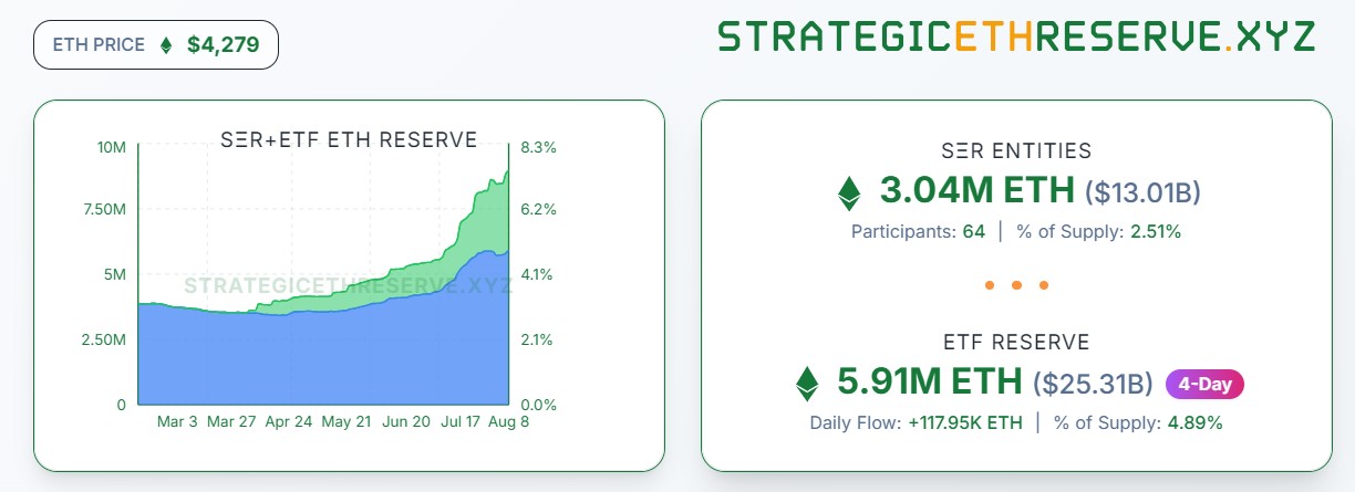 Tổng lượng ETH nắm giữ bởi các công ty có kho dự trữ tiền mã hóa đã tăng lên 3,04 triệu ETH, tương đương 13 tỷ USD, khi giá ETH vượt mốc 4.300 USD.