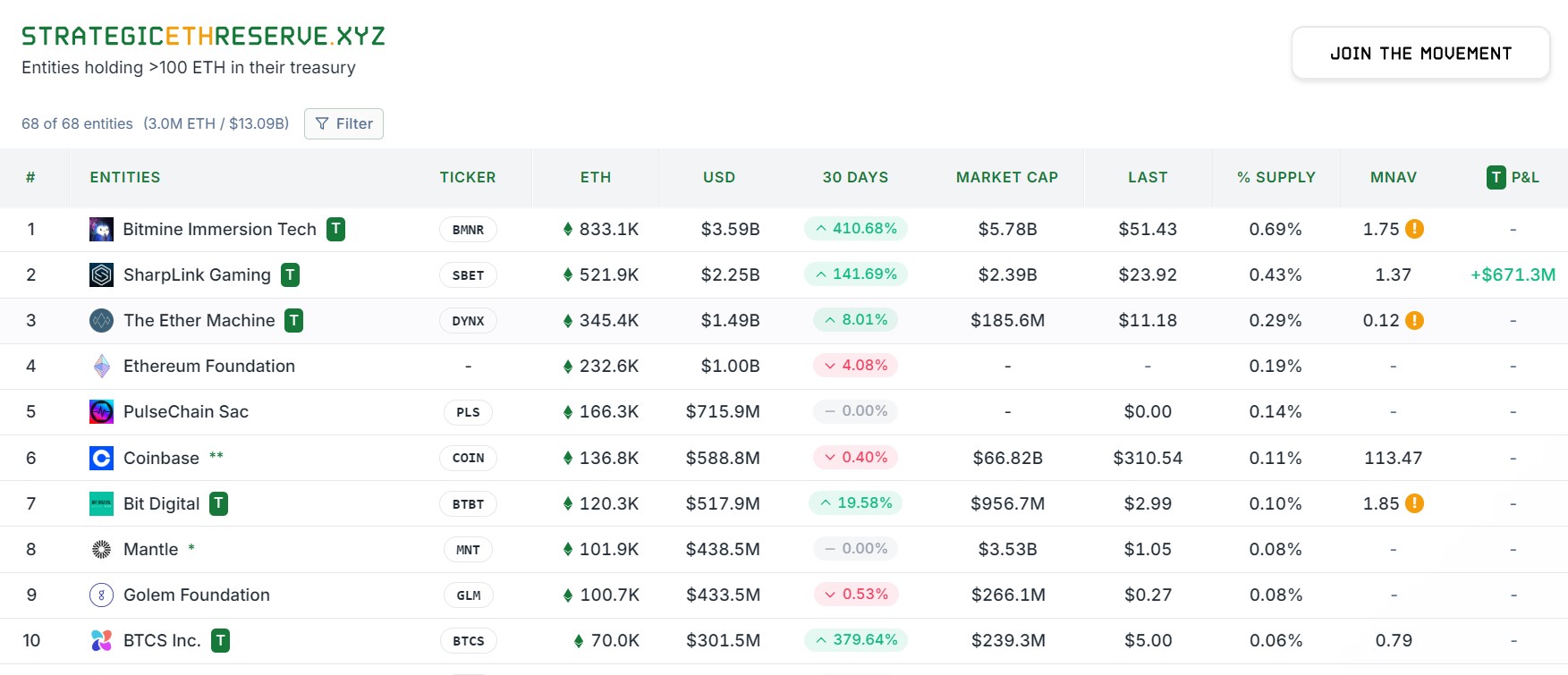 Top 10 doanh nghiệp nắm giữ nhiều ETH nhất (Strategic ETH Reserve)