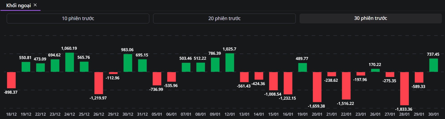 Giao dịch mua/bán ròng của khối ngoại trong 30 phiên gần nhất (Nguồn: VPS)