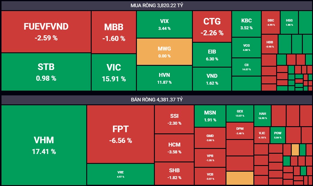 Về giao dịch theo mã, tâm điểm bị khối ngoại bán ròng là cổ phiếu FPT với giá trị lên tới 684 tỷ đồng – mức cao nhất trong tuần. Ngoài ra, các cổ phiếu blue-chips khác như VHM và VRE cũng lần lượt bị xả mạnh với giá trị 319 tỷ đồng và 252 tỷ đồng. SSI cũng ghi nhận giá trị bán ròng gần 200 tỷ đồng.