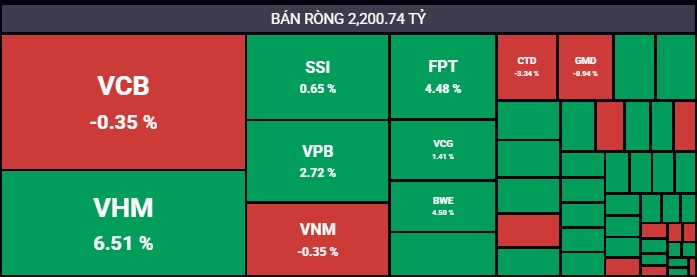 Top cổ phiếu bị bán ròng mạnh nhất: VCB (424,9 tỷ đồng); VHM (334,7 tỷ đồng); SSI (159 tỷ đồng); VPB (150,7 tỷ đồng); VNM (136 tỷ đồng); FPT (119,3 tỷ đồng).