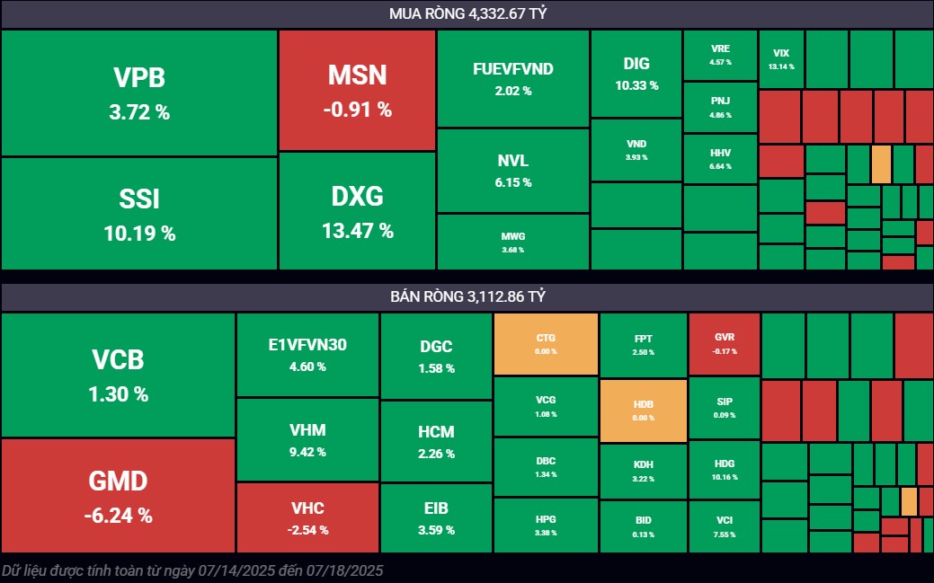 Thị trường chứng khoán Việt Nam ghi nhận tuần giao dịch tích cực (14–18/7), với 3/5 phiên tăng trên 10 điểm/phiên. Thanh khoản thị trường bùng nổ với giá trị giao dịch bình quân đạt gần 34.000 tỷ đồng/phiên.
