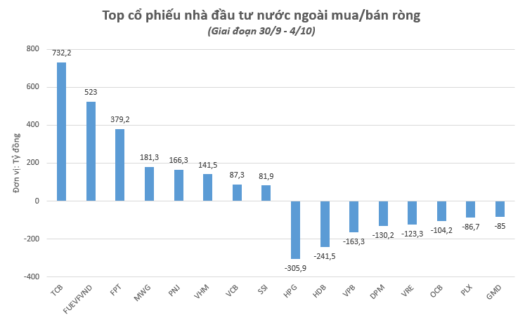 Trên sàn HOSE, tính riêng giao dịch khớp lệnh thì khối ngoại mua ròng 640,4 tỷ đồng. Trong đó, cổ phiếu TCB được mua ròng nhiều nhất với giá trị 732,2 tỷ đồng. Nhà đầu tư nước ngoài cũng mua ròng 523 tỷ đồng chứng chỉ quỹ FUEVFVND, mua ròng 379,2 tỷ đồng cổ phiếu FPT.