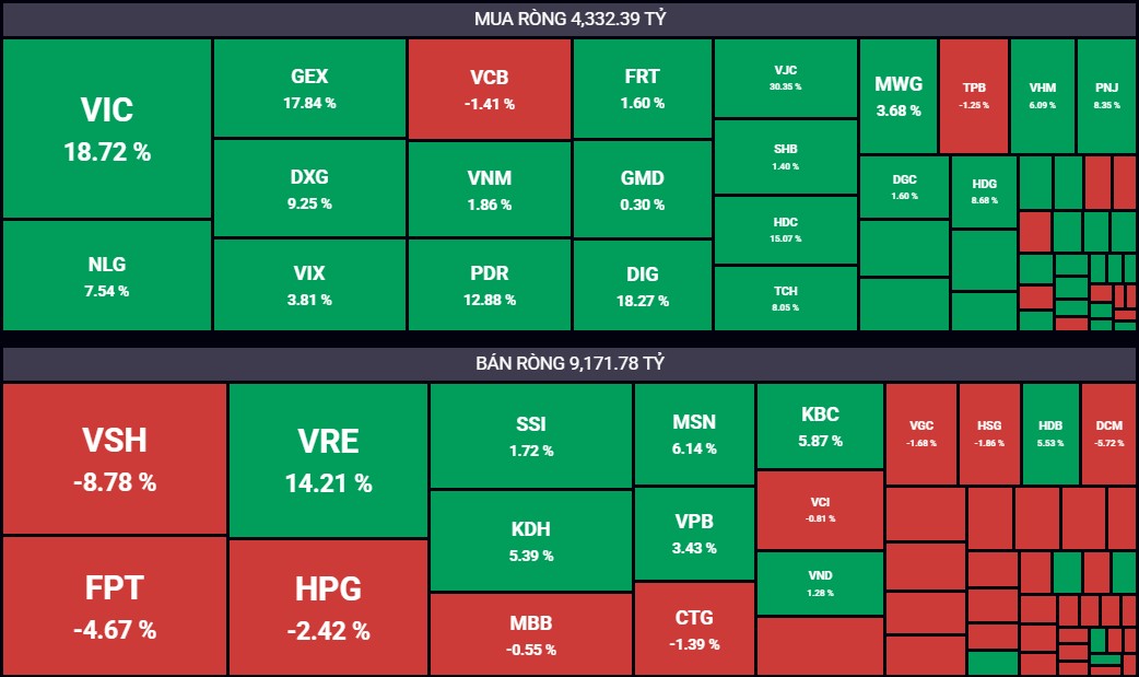 FPT tiếp tục là mã cổ phiếu bị xả mạnh nhất với giá trị bán ròng lên tới 1.095 tỷ đồng. Tiếp theo là VRE (859,6 tỷ đồng), HPG (761,9 tỷ đồng), SSI (582,3 tỷ đồng), KDH (565,7 tỷ đồng), MBB (461,7 tỷ đồng), HDB (319,8 tỷ đồng) và VPB (313,4 tỷ đồng). Các mã CTG, SHS, KBC và VCI cũng ghi nhận lượng bán ròng mạnh, dao động từ 280 - 310 tỷ đồng mỗi mã.