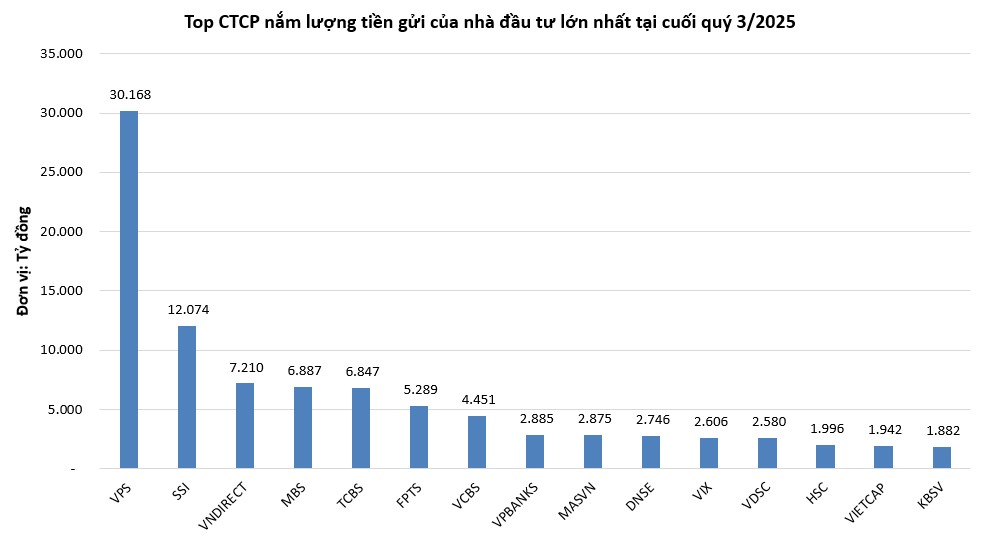 VPS tiếp tục khẳng định vị thế số 1 với gần 30.200 tỷ đồng tiền gửi, cao gấp hơn 2 lần so với SSI (12.074 tỷ đồng) và hơn 4 lần so với VNDirect (7.210 tỷ đồng). Các vị trí tiếp theo lần lượt thuộc về MBS (6.887 tỷ đồng), TCBS (6.847 tỷ đồng) và FPTS (5.289 tỷ đồng).