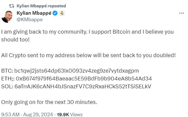 Tài khoản X (có dấu tích xanh) của Kylian Mbappe – với hơn 14 triệu người theo dõi – bị hack và đăng một loạt tweet có nội dung quảng cáo về lại tiền điện tử có tên “$MBAPPE”.