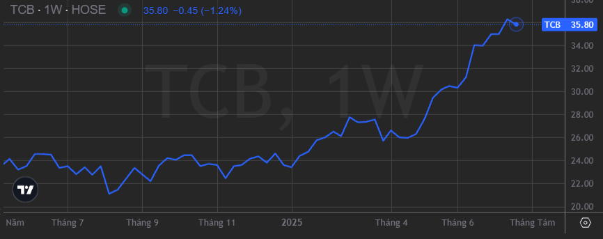 Cổ phiếu TCB tăng hơn 40% từ đầu năm 2025 tới nay (Nguồn: TradingView)