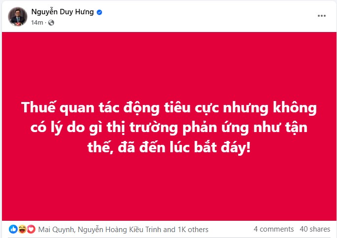 "Thuế quan tác động tiêu cực nhưng không có lý do gì thị trường phản ứng như tận thế, đã đến lúc bắt đáy!", ông Nguyễn Duy Hưng viết trên trang cá nhân.