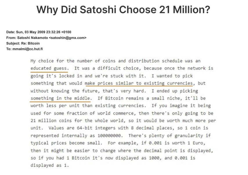 Email giải thích lý do tại sao Satoshi Nakamoto chọn tổng cung tối đa của Bitcoin là 21 triệu coin (Nguồn: river.com)