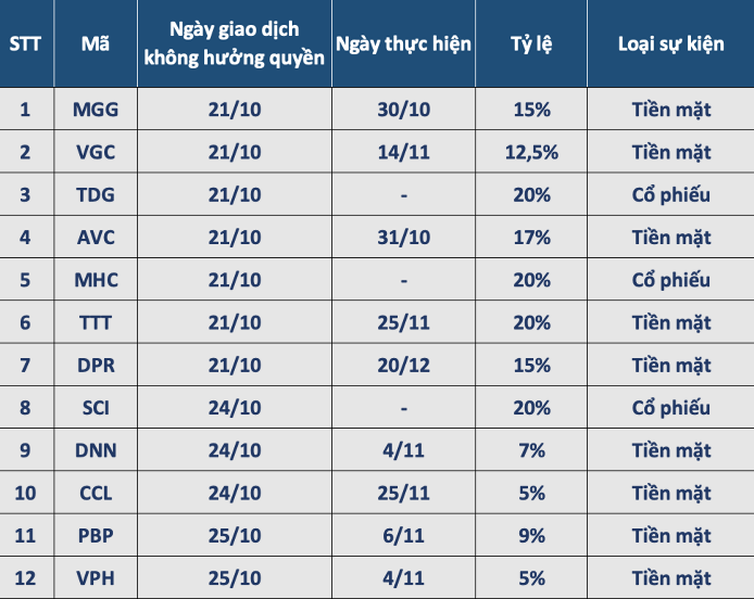 Tuần tới, Tổng Công ty Đức Giang - CTCP (Mã: MGG) cũng chốt quyền nhận cổ tức năm 2023 bằng tiền, tỷ lệ 17% (1 cổ phiếu nhận 1.700 đồng). Ngày đăng ký cuối cùng là 22/10, tương ứng ngày giao dịch không hưởng quyền là 21/10. Thời gian thực hiện là 30/10.
