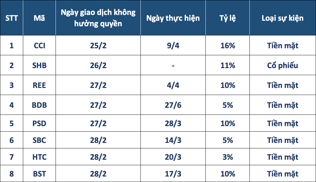 Ngày đăng ký cuối cùng là 28/2, tương ứng ngày giao dịch không hưởng quyền là 27/2. Ngày thanh toán dự kiến là 28/3.