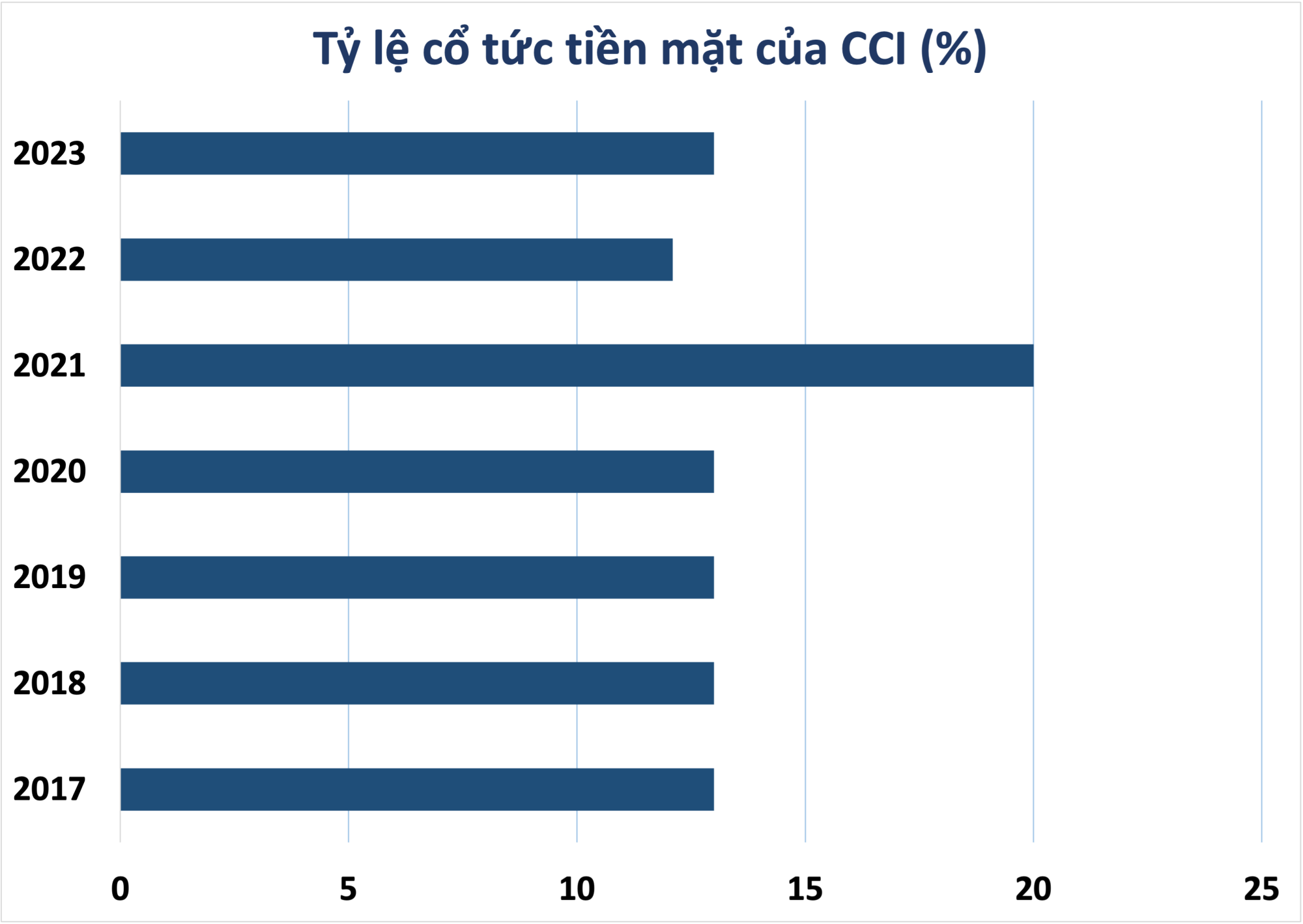 Những năm gần đây, CCI thường chia cổ tức tiền mặt cho cổ đông. Tỷ lệ năm 2022 là 12,1%, năm 2023 là 13%. Mức cổ tức năm 2024 dự kiến từ 13% trở lên.
