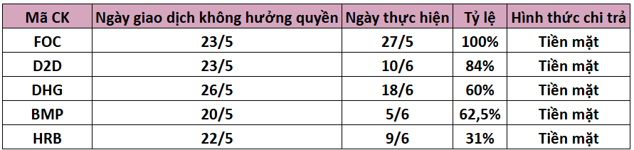 Theo thống kê, trong tuần từ 19/5 đến 23/5, thị trường chứng khoán có 50 doanh nghiệp chốt ngày giao dịch không hưởng quyền để nhận cổ tức tiền mặt, cổ phiếu.