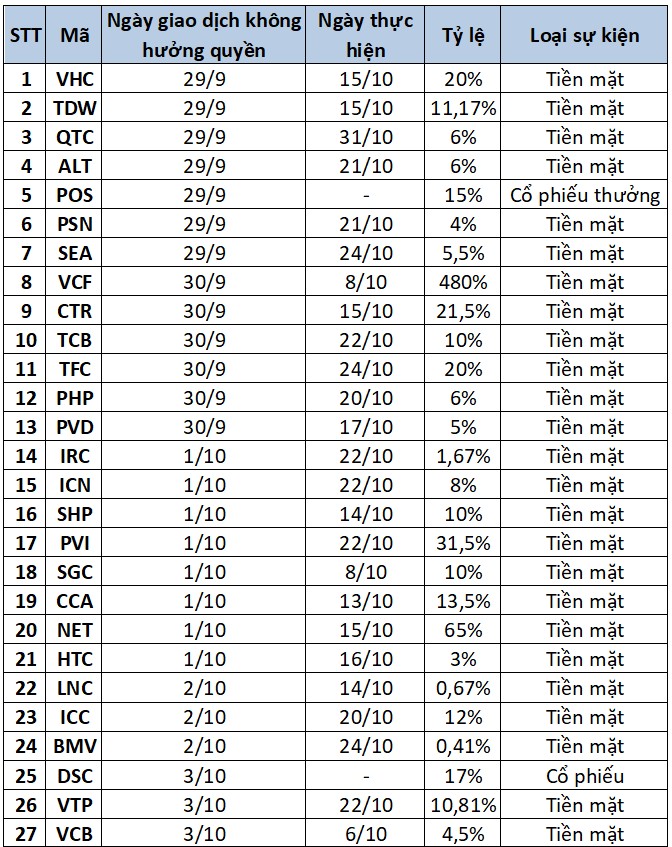 Trong tuần từ 29/9 đến 3/10, thị trường chứng khoán ghi nhận 27 doanh nghiệp chốt ngày giao dịch không hưởng quyền để chi trả cổ tức bằng tiền mặt hoặc cổ phiếu.