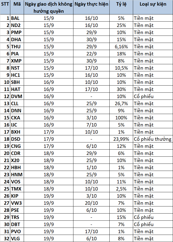 Trong tuần giao dịch từ 15/9 đến 19/9, có 32 doanh nghiệp sẽ chốt danh sách cổ đông để thực hiện quyền chi trả cổ tức tiền mặt hoặc cổ phiếu.