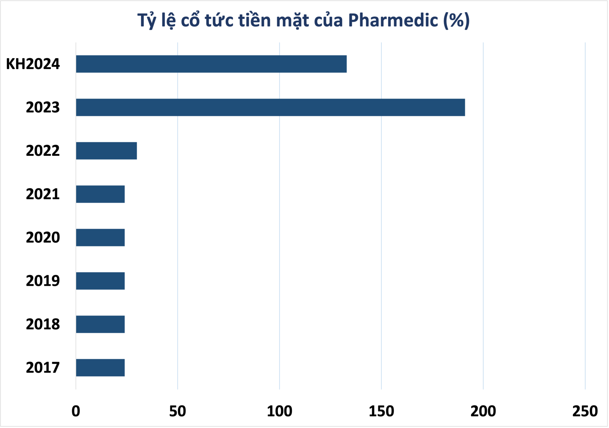 Kể từ khi niêm yết, Pharmedic luôn duy trì mức cổ tức tiền mặt trên 20%. Năm 2023, công ty còn chia thêm cổ tức cho cổ đông với tỷ lệ cao sau khi cân đối được nguồn tái đầu tư.