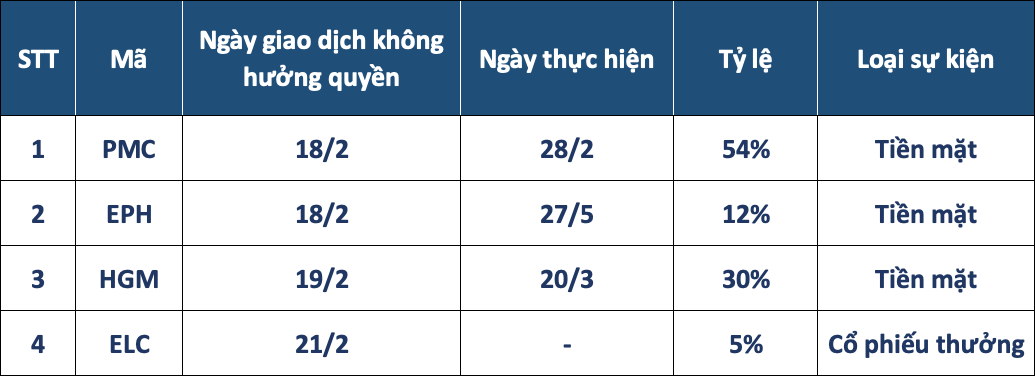 Ngày đăng ký cuối cùng là 20/2, ngày giao dịch không hưởng quyền là 19/2. Thời gian thực hiện là 20/3.