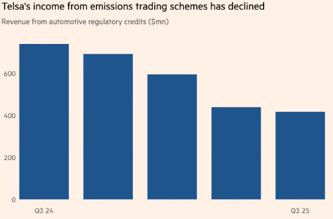 Bên cạnh đó, doanh thu từ bán tín chỉ khí thải cho các hãng xe xăng giảm tới 44%, chỉ còn 417 triệu USD trong quý 3, sau khi chính quyền Mỹ hạ mức phạt với vi phạm tiêu chuẩn khí thải về 0 USD, gần như “khai tử” thị trường này.
