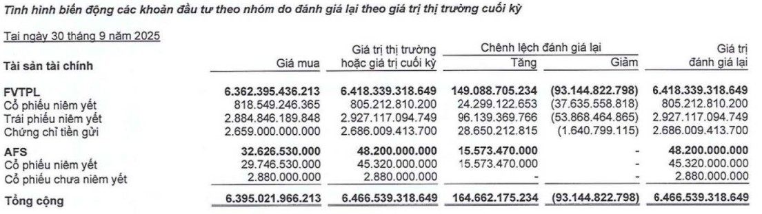 Khoản đầu tư này được hạch toán vào danh mục “Các tài sản tài chính ghi nhận thông qua lãi/lỗ (FVTPL)”, với giá trị thị trường tại ngày 30/9/2025 đạt 805,2 tỷ đồng – tức thấp hơn khoảng 13 tỷ đồng so với giá gốc đầu tư.